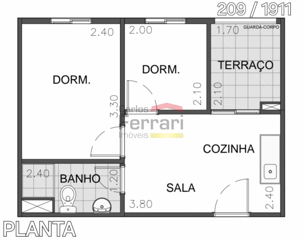 Com uma planta quadrada, este projeto proporciona uma harmoniosa distribuição dos cômodos. 2 dormitorios, sala com cozinha integrada, banheiro e uma confortável sacada.